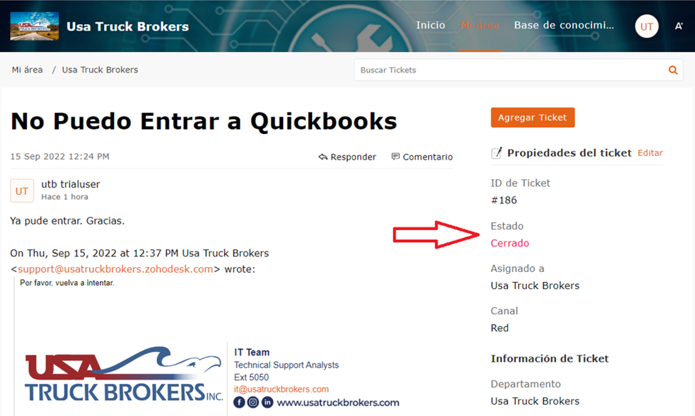 Usted puede avisarle al equipo de soporte que el problema está resuelto respondiendo normalmente o usted puede cerrar el ticket por su cuenta a través del portal. Si el equipo de soporte le proporcionó una respuesta y usted no ha informado que el problema se resolvió, el equipo de soporte considerará que el problema fue resuelto y cambiará el estado del ticket a “cerrado” después de 24 horas. Usted recibirá un email una vez que el ticket esté cerrado.
