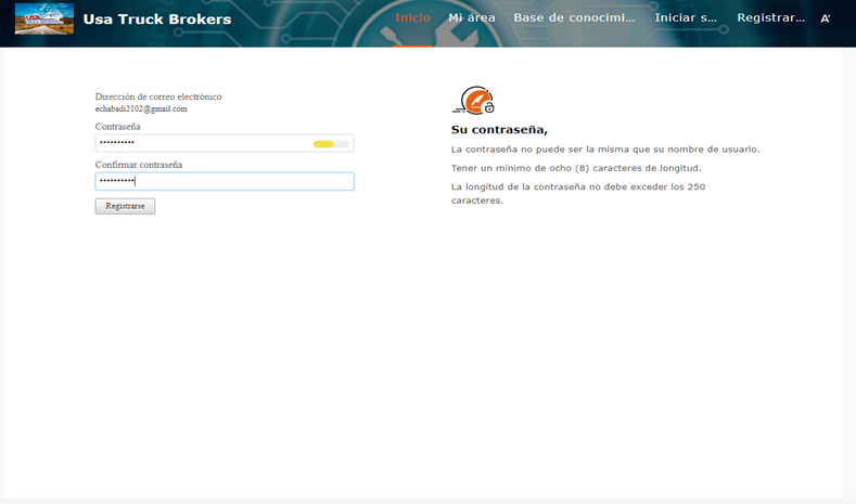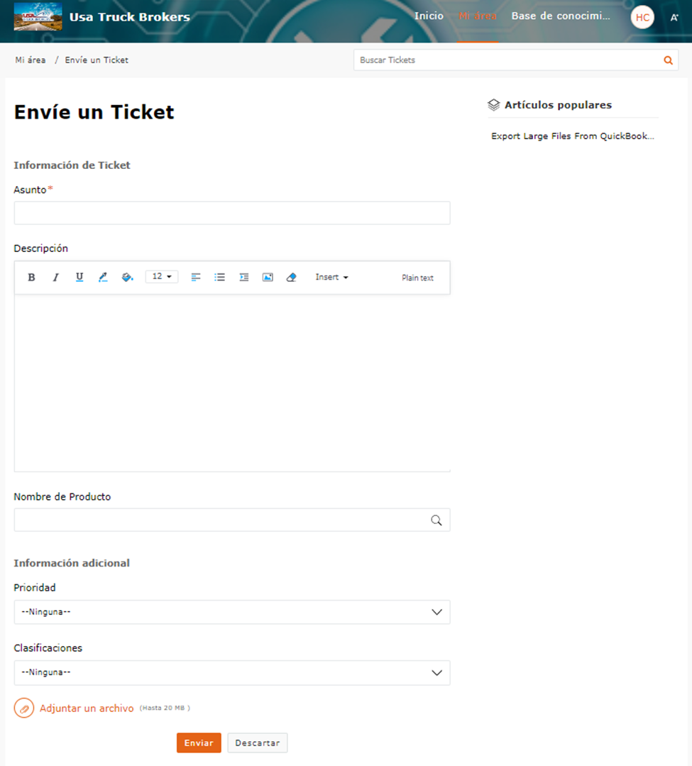 1- Mande un email desde su email de compañía a helpdesk@usatruckbrokers.com con asunto y una descripción del problema. Usted también puede adjuntar archivos con un total de menos de 20MB.